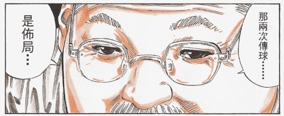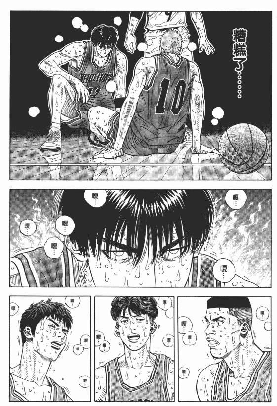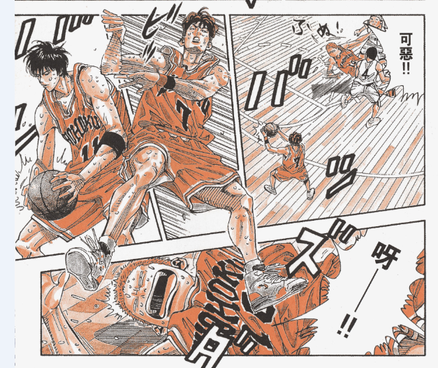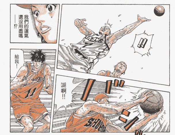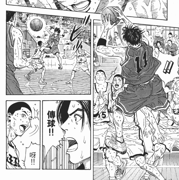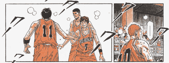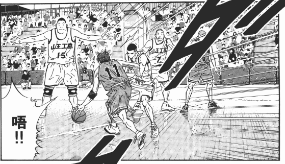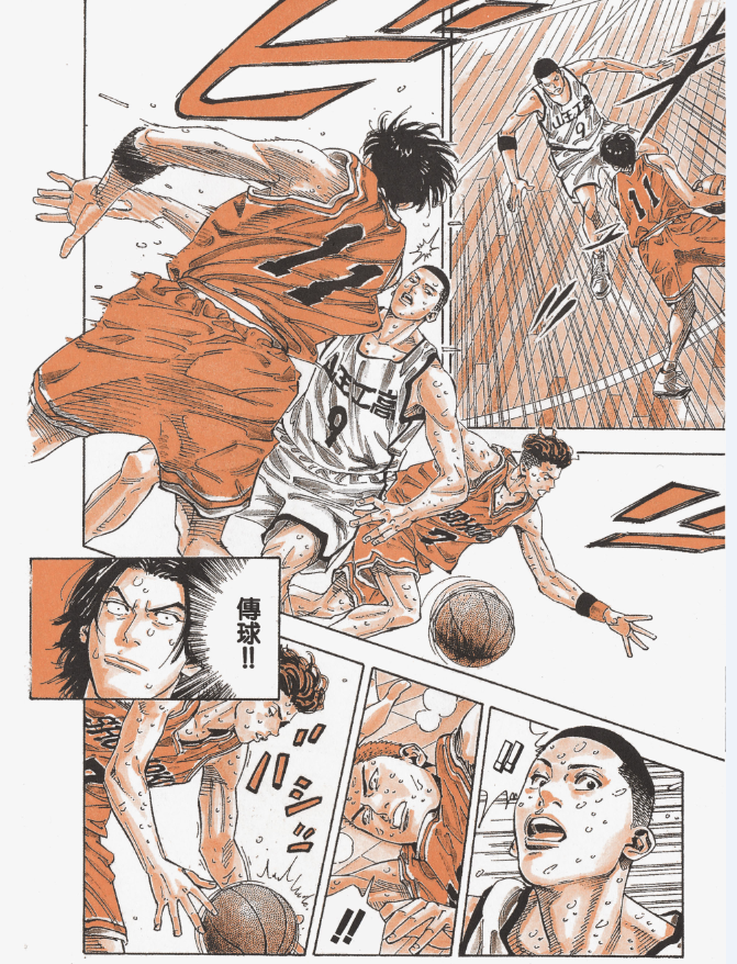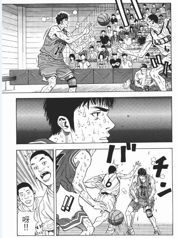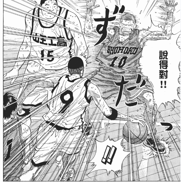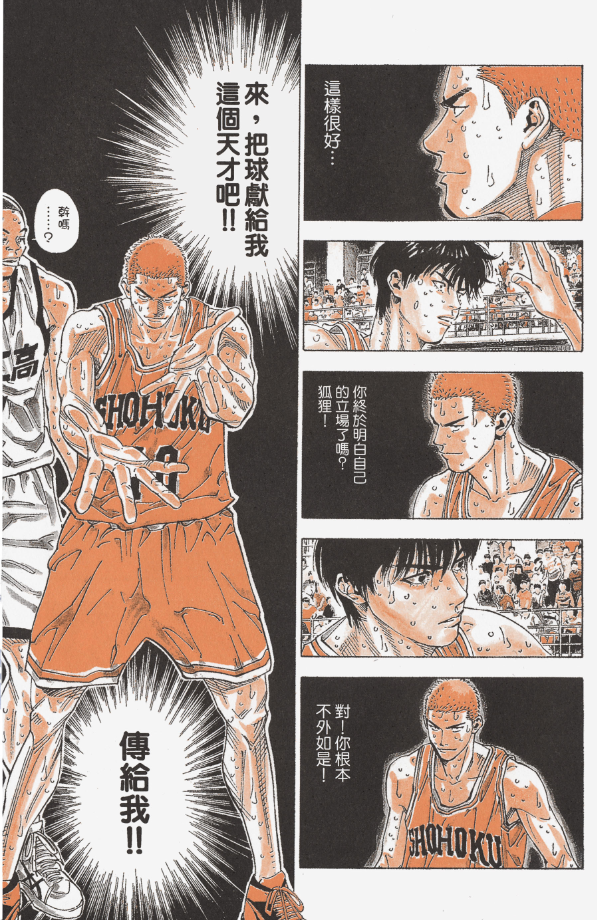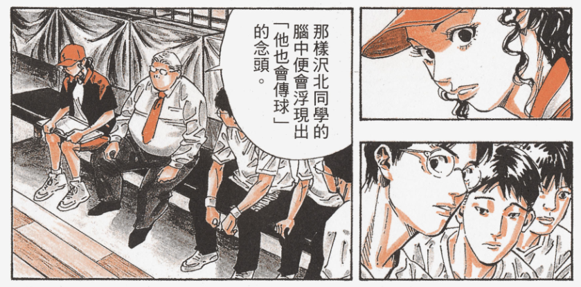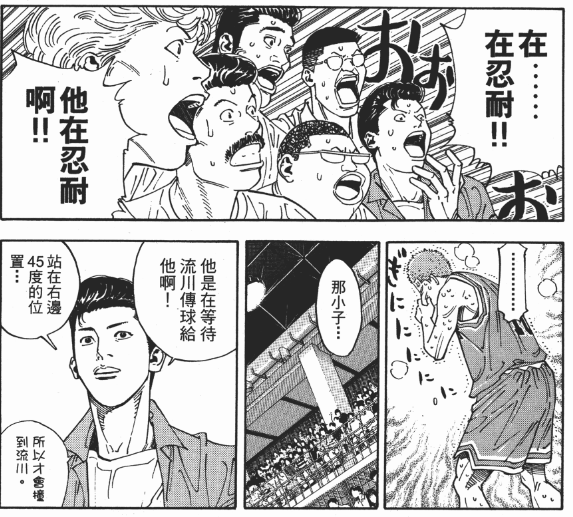 這張圖裏,每個人的表情,跟櫻木的錯誤判斷一起,證明了流川的佈局迷惑性有多大——山王方面,大概只有堂本一人是鎮定的,其他人都沒想到。