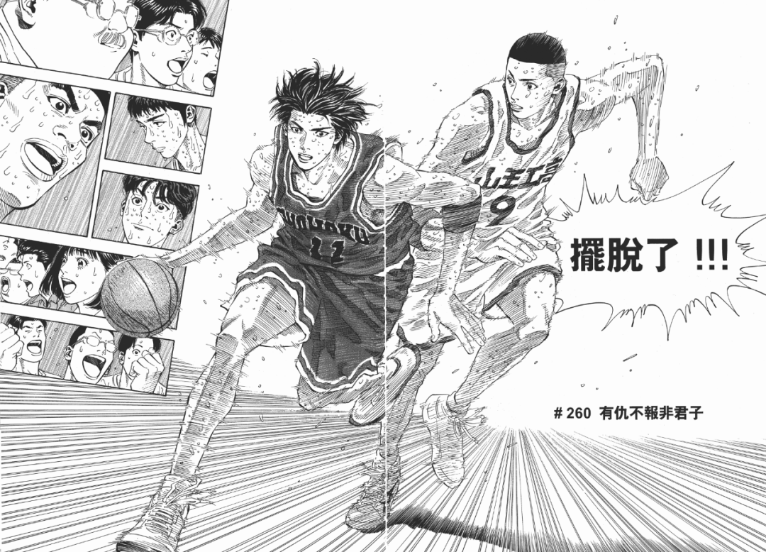 可井上的意思並非如此——流川並沒有報仇呀,他放棄了去跟澤北一對一爭高下,才有了赤木的連續兩次終結,以及,形成“佈局”之後,對澤北的擺脱。某種意義上,這是放下“仇恨”,才獲得的回報。