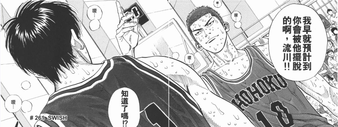 這一章節,兩個放下執念和怨念的少年,不但回擊了強大的澤北,也戰勝了足以澆滅士氣的那次致命失誤。井上用兩個對應的回合,讓櫻木用相同的方式阻攔了流川和澤北,呈現出的卻是兩邊完全不同的籃球格局。如果説,流川在這一刻超越了澤北,那麼一定不是球技層面的,因為這本就不是一場公平的對決——一個人,打不過一個團隊。
