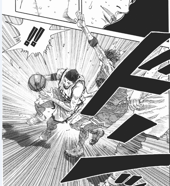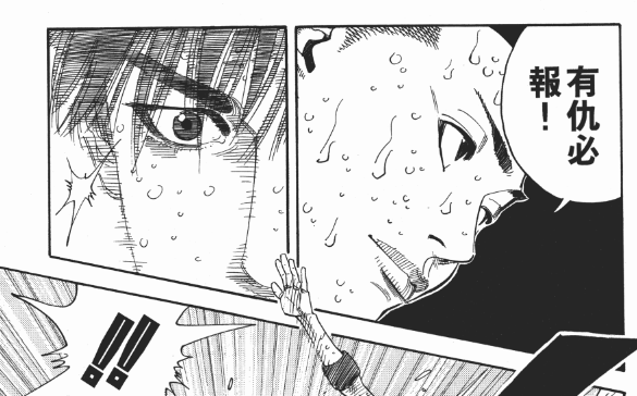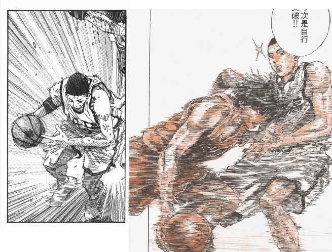 這個題目和畫面同時出現時,會造成一種錯覺——流川擺脱了澤北,終於報了之前被吊打的仇,讀者可能會認為:“果然,流川這樣驕傲的籃球手,是不能允許對手騎在他頭上撒野的,他終於報仇了。”