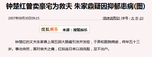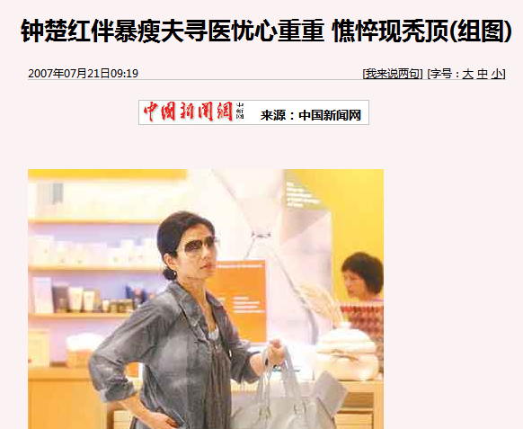 但不幸的是,2005年朱家鼎患癌,雖然做了切除手術,但問題並沒有解決。兩年多來,鐘楚紅陪着丈夫看病,尋訪找中醫名師,各種嘗試到心力交瘁,甚至嚴重脱髮。
