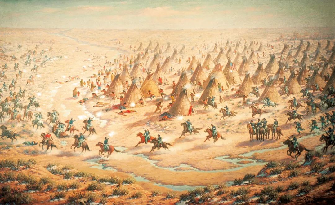 ▲1864年沙溪大屠殺。印第安人為了保衞人民和家園而反擊,為美國軍隊殺死任何印第安人,哪怕是追求和平的部落提供了理由。約700名美國士兵毫無預警地襲擊了保留地,屠殺了160名印第安人,其中大部分是婦女和孩子。