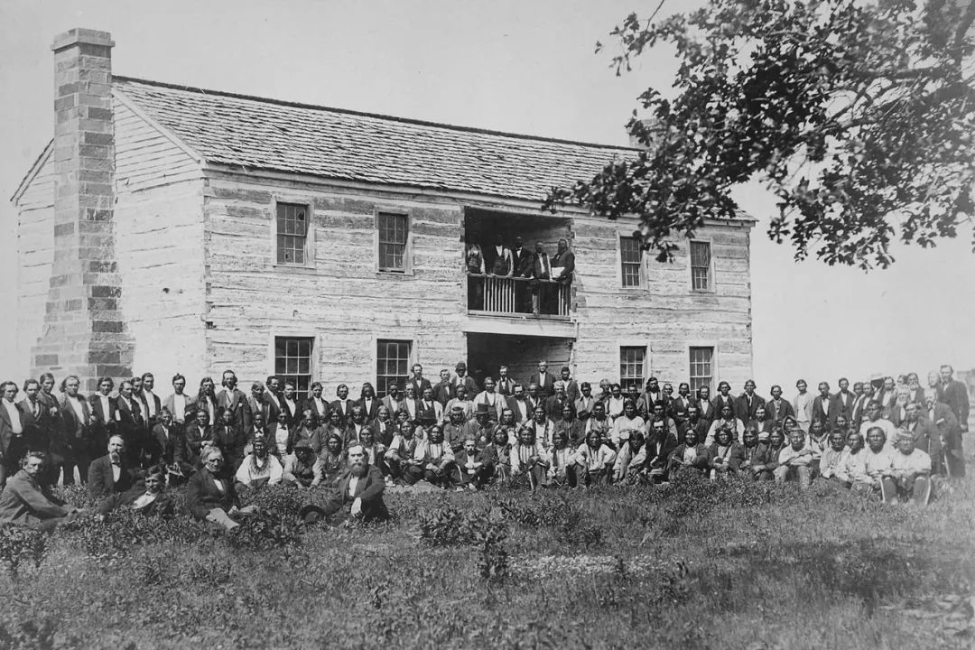 ▲1880年,34個部落的原住民代表在印第安保留地的克里克議會大廈前合影。從1878年到俄克拉荷馬州建州,這座樓曾是當地政府所在地。