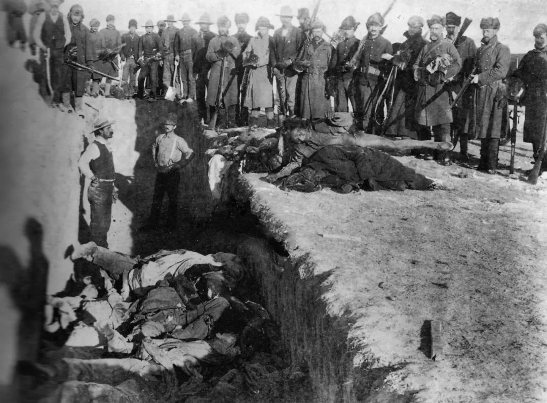 ▲1890年傷膝河大屠殺。美國軍隊在傷膝河附近包圍了印第安人並要求其放棄武器。一名耳聾的印第安人不願交出武器,在爭執中發生了槍支走火,美軍便開始射殺手無寸鐵的印第安人。
