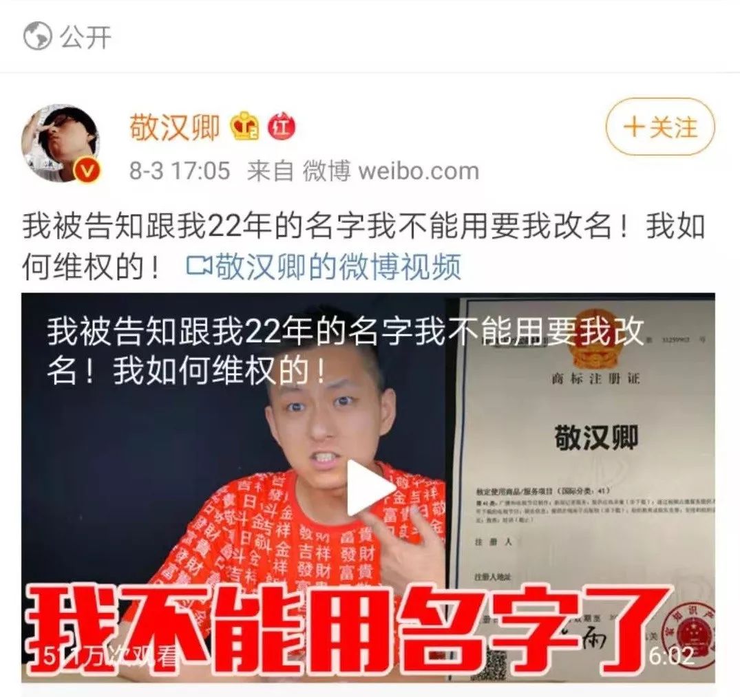 第二,敲詐勒索。2019年8月,B站知名UP主“敬漢卿”被一家個體工商户告知,“敬漢卿”已經被他註冊為商標,要求“敬漢卿”改名,否則會委託律師查封“敬漢卿”在各大視頻平台的所有賬號。