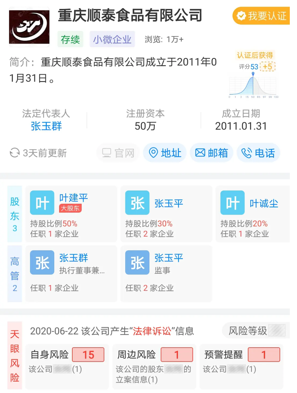 據天眼查顯示,葉誠塵是重慶一食品公司法定代表人,家裏開公司。