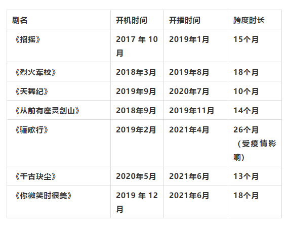 2018年,趙露思憑藉《鳳求凰》走紅,後因《傳聞中的陳芊芊》名聲大噪,她所擔任主演的劇作開播速度也很快,比如《我,喜歡你》開機到開播的時間跨度還不足半年,而《三千鴉殺》《一不小心撿到愛》的開播跨度也未超過一年。