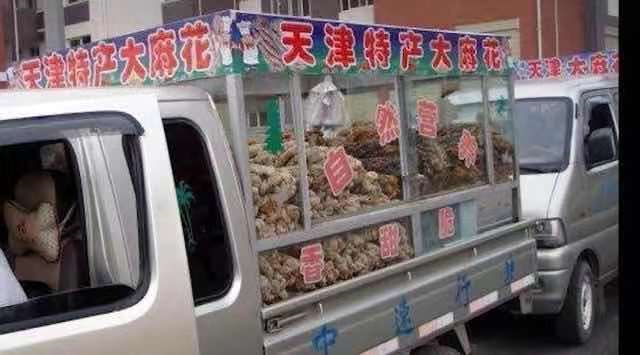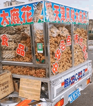 銀白色的小貨車,後面拉着的透明玻璃櫃裏裝滿了撒滿芝麻的誘人大麻花,車上的喇叭裏循環播放着純正天津口音的叫賣聲。