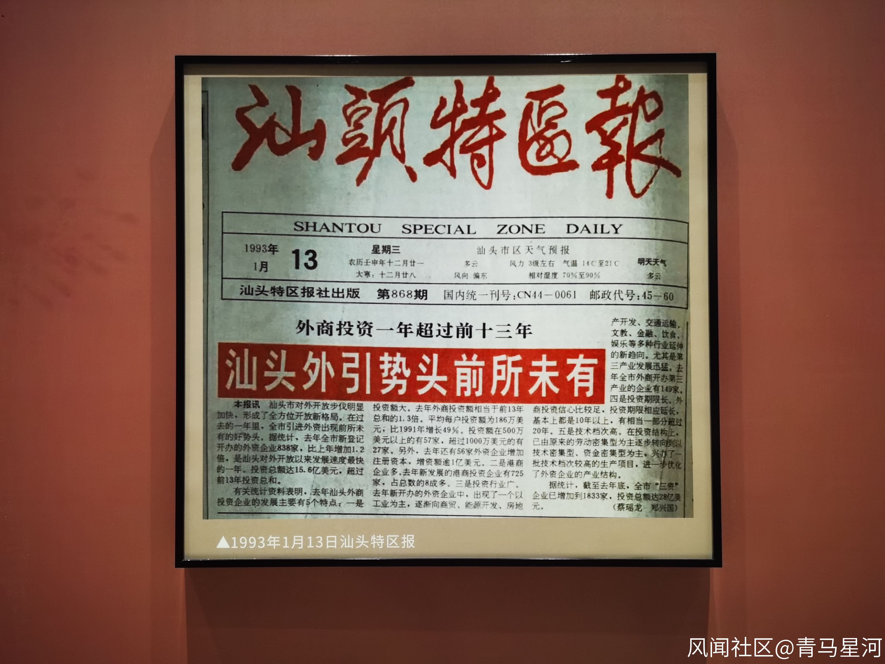 圖為1993年1月的汕頭市的特區報。汕頭市是最早成立經濟特區的14個城市之一,也是全國著名僑鄉和政治經濟中心。經濟特區的崛起不僅為人民帶來了幸福,還加快了城市的建設。