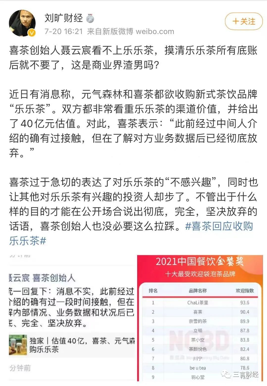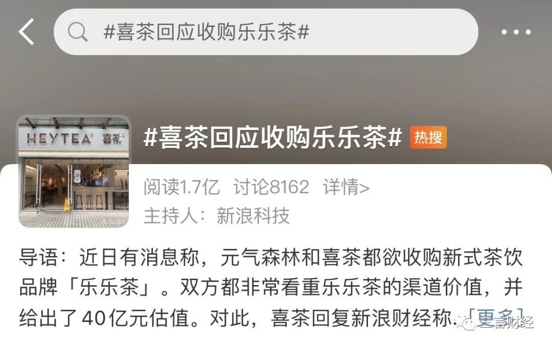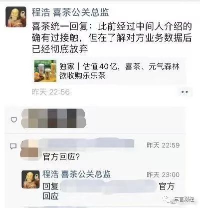 樂樂茶方面則回應稱,樂樂茶目前獨立發展,經營狀況良好,並無被收購計劃。