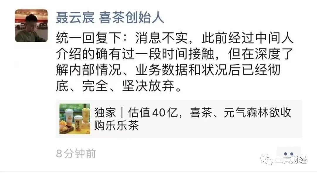 隨後,喜茶創始人聶雲宸轉發了相關報道,並回應稱“消息不實,此前經過中間人介紹的確有過一段時間接觸,但在深度瞭解內部情況、業務數據和狀況後已經徹底、完全、堅決放棄。”