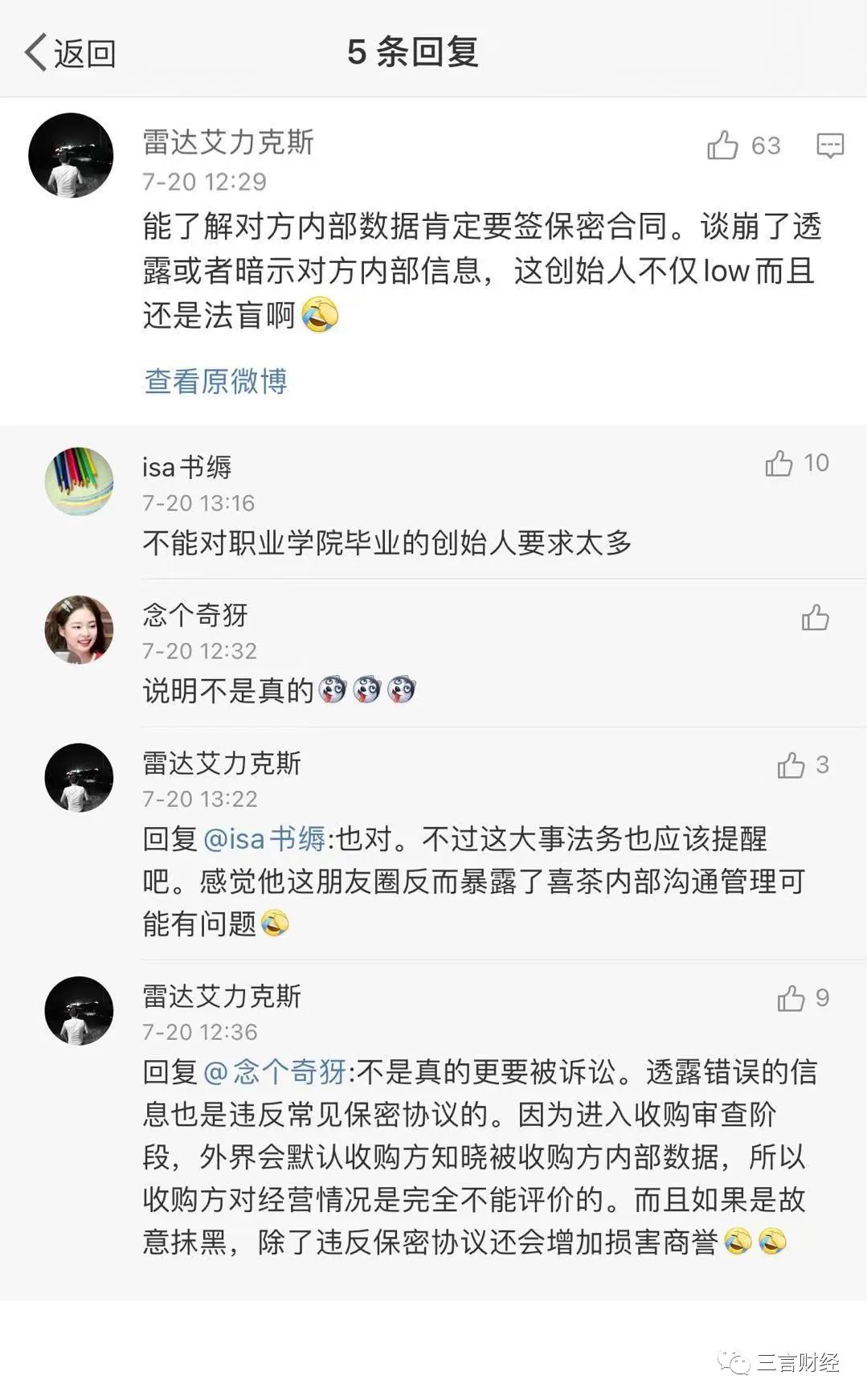 有網友指出,談崩了就透露對方內部信息,“這創始人不僅low而且還是法盲啊”。