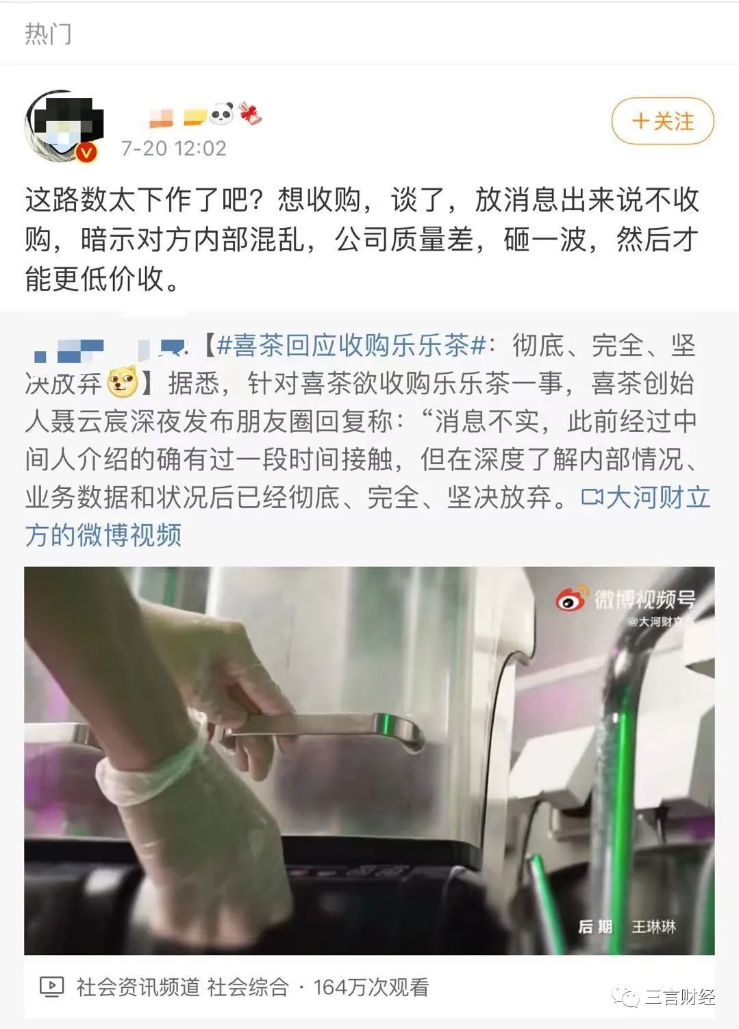 這位網友還指出,喜茶過於急切地表達了對樂樂茶的“不感興趣”,同時也讓其他對樂樂茶有興趣的投資人卻步了。