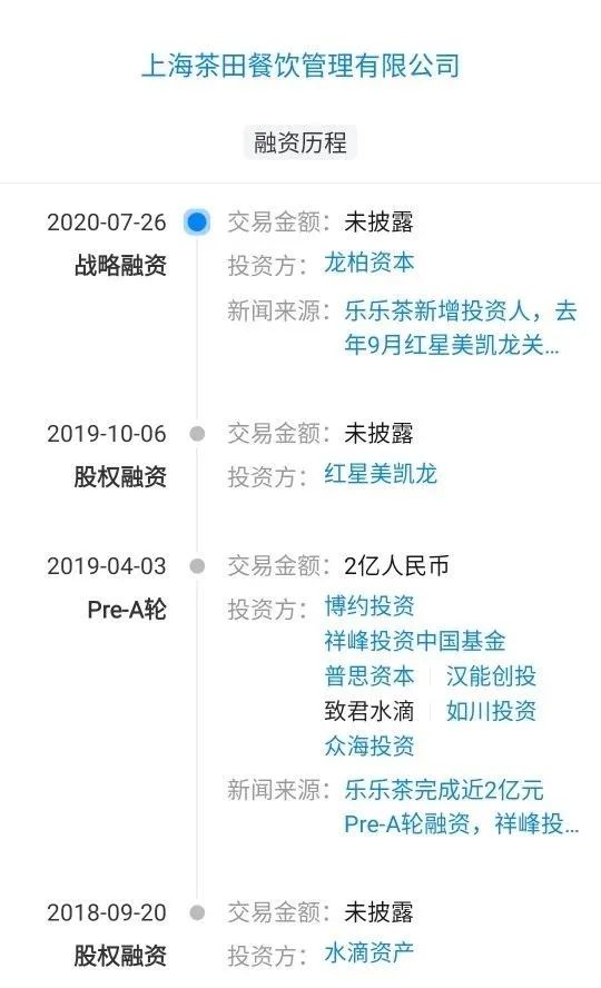 而從2018年至今,樂樂茶共完成4輪融資,上一輪融資為2020年7月份,龍柏資本投資。此前,紅星美凱龍、王思聰旗下的普思資本都曾參與樂樂茶的融資。