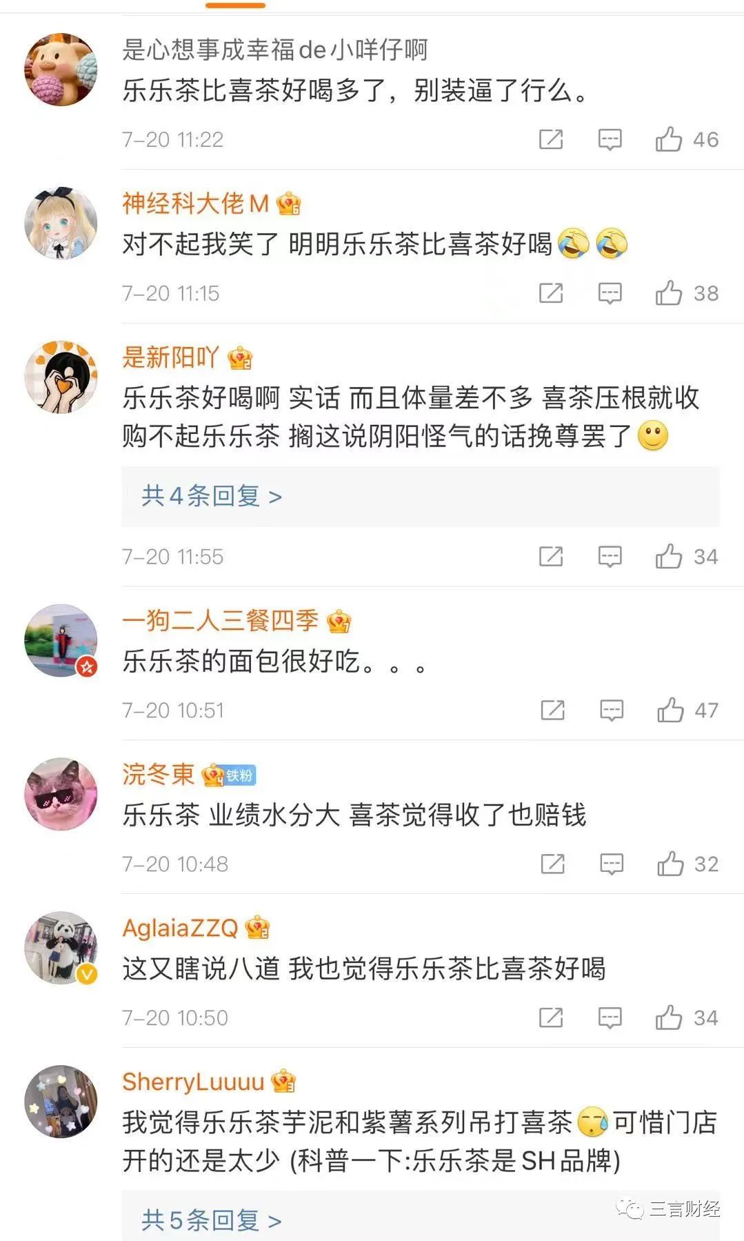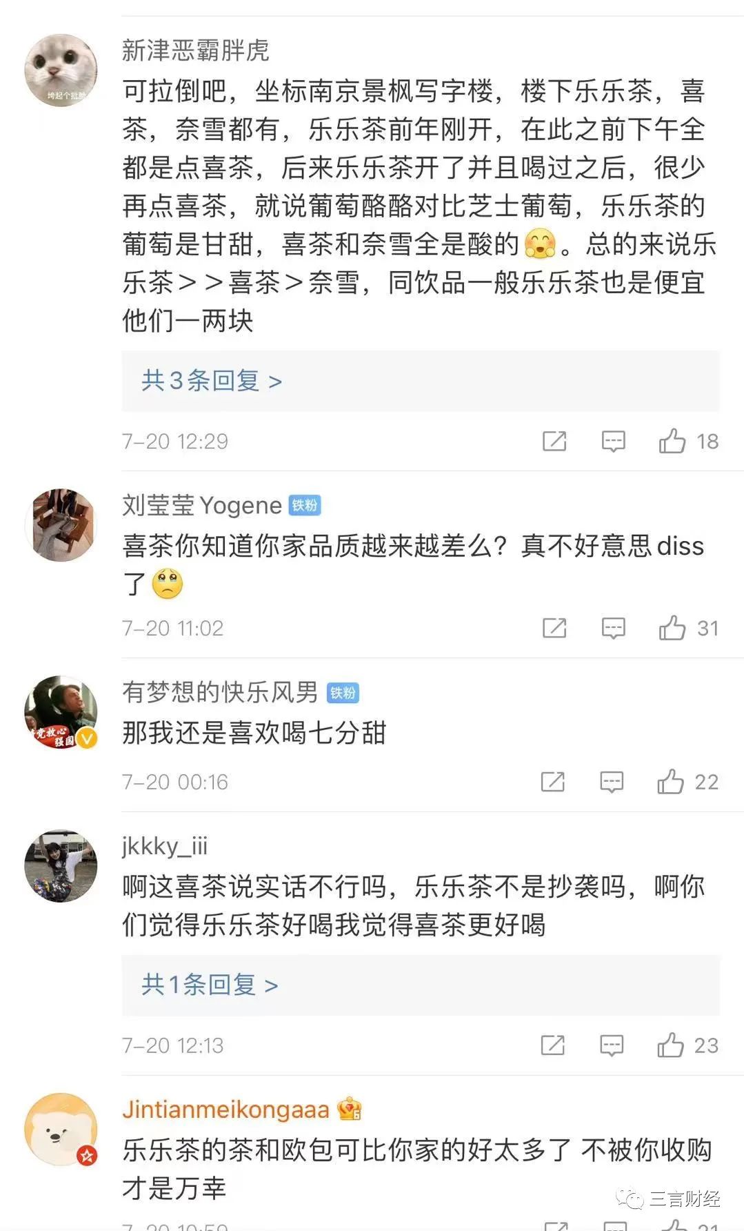 還有不少網友力挺樂樂茶,稱比喜茶好喝多了。