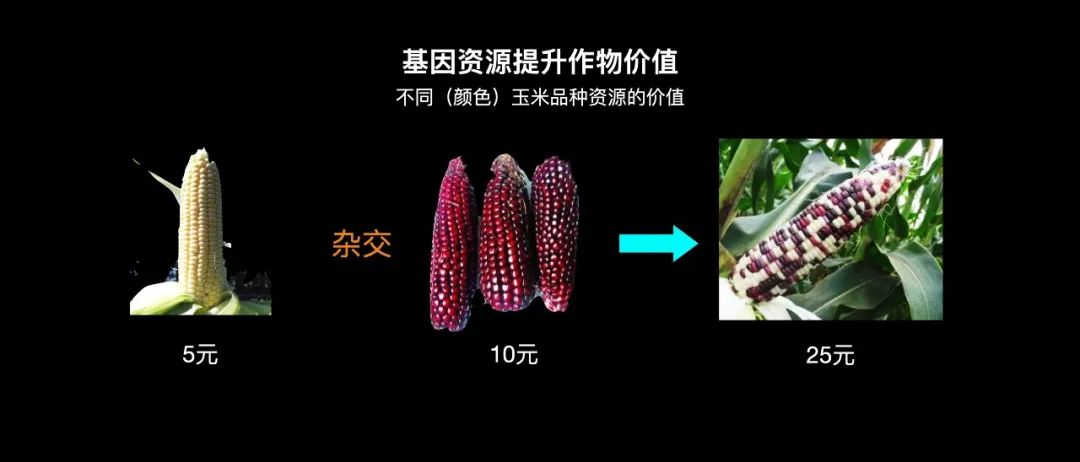 而我們的農民非常地聰明,他們把紫色的和白色的玉米一雜交,就變成了**花色的玉米。**花色的玉米一下就漲到25塊錢一斤了。所以基因資源可以給我們帶來價值的提升。