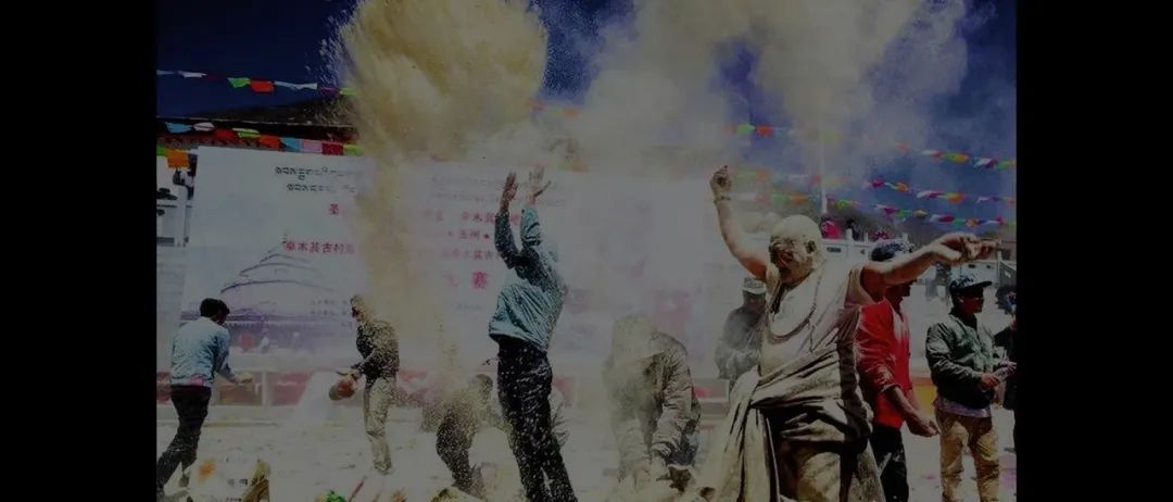 這兒有一張圖,表現了青藏高原的**糌粑節。**我們的糌粑節不比西方的狂歡節要遜色。到了糌粑節,農民高興得不得了,要用糌粑粉在每個人臉上塗一點,讓大家沾沾喜氣。