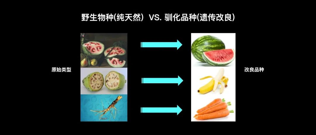 最上面那幅圖是經過改良的西瓜,沒有經過改良的話西瓜不可能這麼好、這麼大、這麼甜;左邊中間這一個沒有被馴化的東西,是香蕉;而最下面像根一樣的東西,居然是我們的胡蘿蔔。