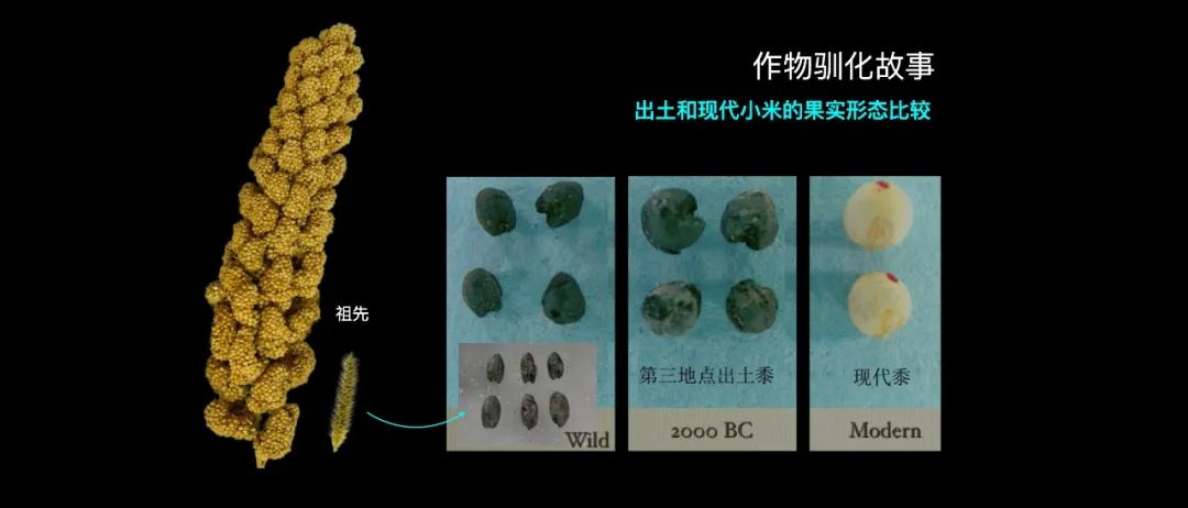 還有趣事,比如**小米的祖先就是狗尾巴草。**在馴化的過程中,這麼小的狗尾巴草,它的體積增長了100多倍。如果我們立體來看,它是很大的。而且很重要的是,以前它的種子很小,像梭子一樣;但是現在變得更大了一些,也更圓了,很神奇。