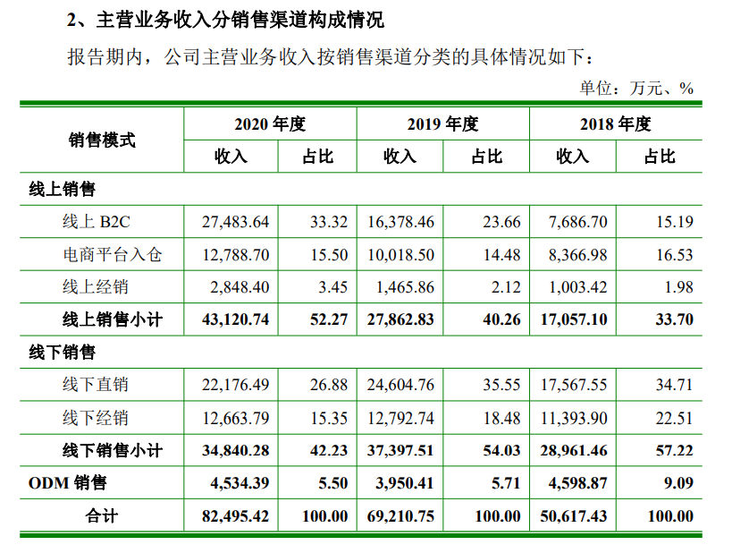 根據招股書,倍輕鬆目前主要採用“計劃生產”和“訂單生產”相結合的模式進行生產。後者主要針對其ODM代工加工業務,前者是根據對未來某段時間內市場所需產品種類和數量的預估來確定的。而這種生產模式,將與其越來越依賴的線上銷售方式發生衝突。