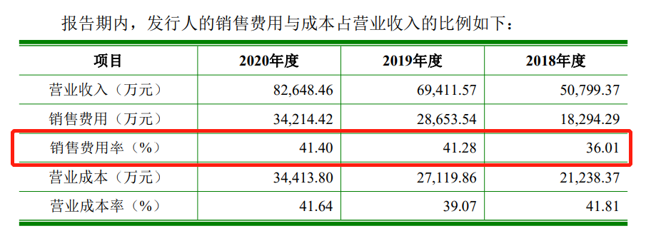 根據招股書,2018-2020年,倍輕鬆的銷售費用分別為1.83億元、2.87億元、3.42億元,總計高達8.12億元,銷售費用率分別為36.01%、41.28%、41.4%,銷售費用率遠高於行業平均水平。公開資料顯示,2020年度,可與倍輕鬆進行比較的智能硬件品牌奧佳華、石頭科技、科沃斯的銷售費用率分別為15.77%、12.36%、23.27%。