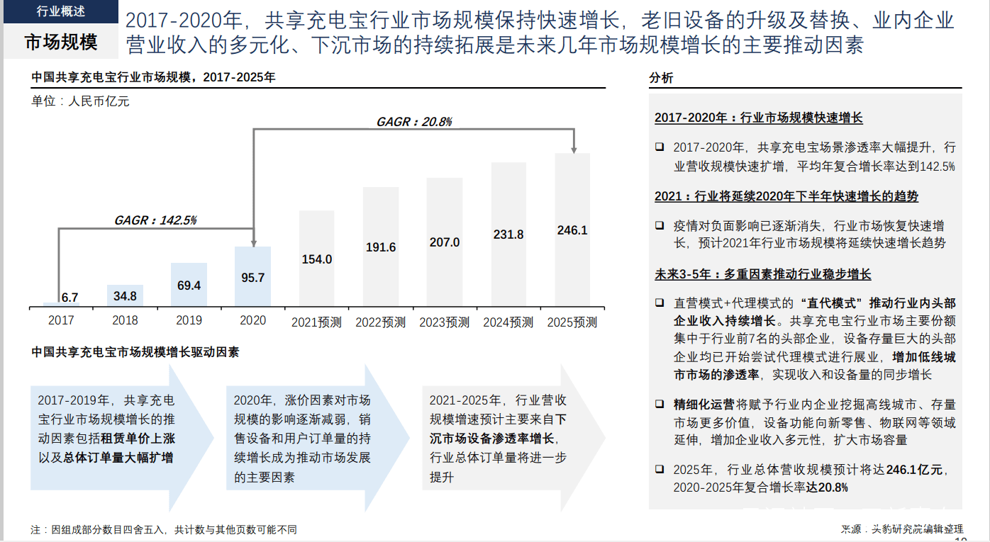 根據頭豹研究院的數據指出,2017-2020年,共享充電寶行業市場規模保持快速增長,老舊設備的升級及替換、業內企業營業收入的多元化、下沉市場的持續拓展是未來幾年市場規模增長的主要推動因素。而未來3~5年,多重因素推動行業穩步增長。預計到2025年,行業總體營收規模將達到246.1億元,複合增長率達到20.8%。