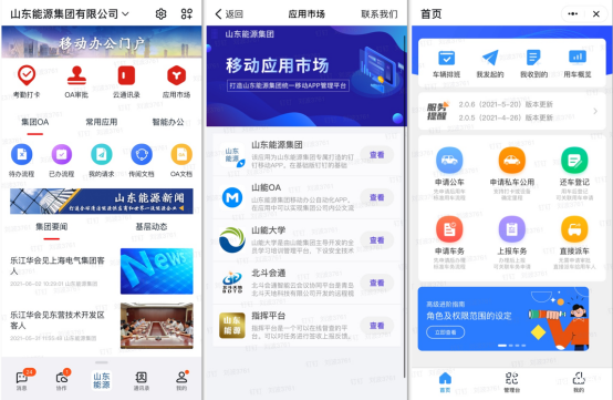 基於雲釘一體的開發能力,山能集團在釘釘上自開發了應用市場——15天內上線5款應用,包括雲通訊錄、會議室管理、餐廳管理、易車隊和考勤系統等,所有子公司都可以在釘釘上按需使用,大大提升了管理效率。