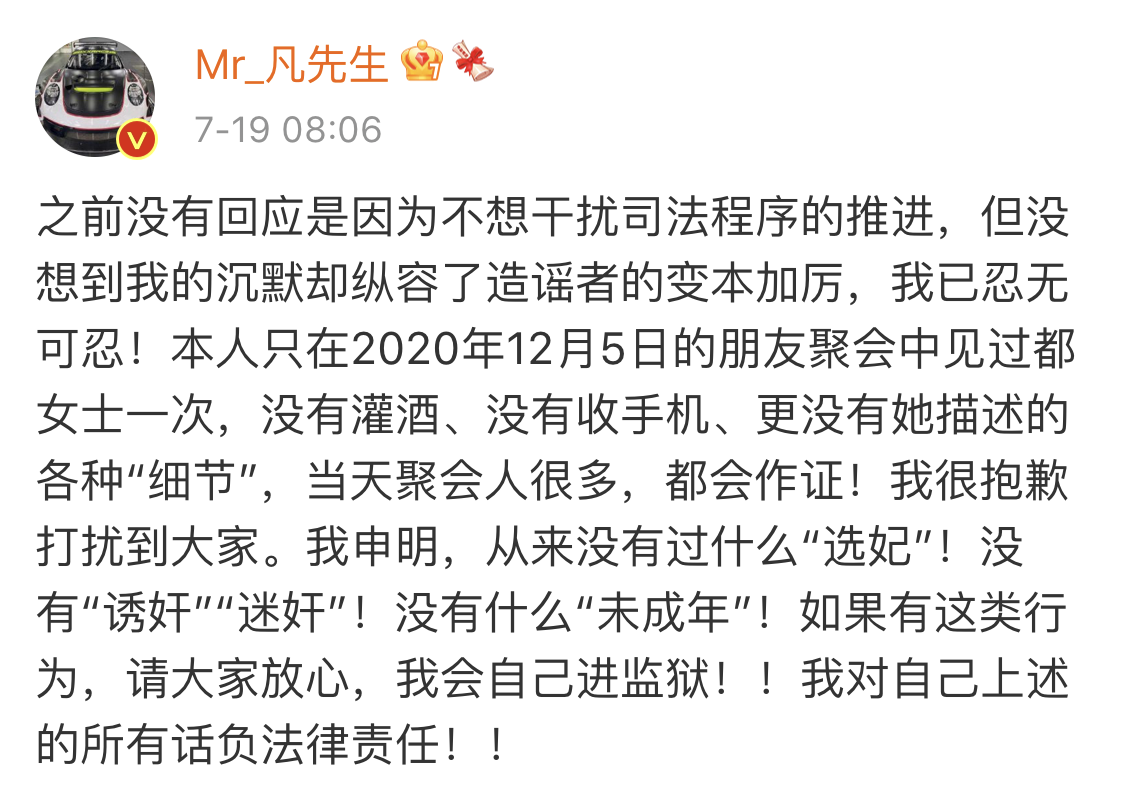 在都美竹接受媒體的採訪中,透露了不少令人瞠目結舌的內容,例如她稱吳亦凡會以各種方式物色、誘騙年輕女性發生關係,包括自己在內的受害者遠超8人,其中包括2名至今未成年的女性。她還表示“做好了走法律程序的準備”。此後吳亦凡方的回應也明確表示“已報案”,其本人否認都美竹的爆料並表示如果爆料屬實會“自己進監獄”。