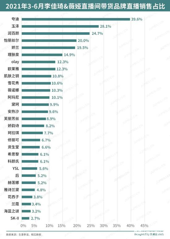 再者,只有新消費品牌才如此倚重流量嗎?事實並非如此。2021年3月-6月,我們看生意參謀與知瓜數據,美妝品牌來自李佳琦與薇婭直播間帶貨品牌直播銷售佔比,嬌蘭、olay、歐萊雅、阿瑪尼、資生堂、YSL、雅詩萊黛等國際品牌。而花西子僅為4%,排名第26位。