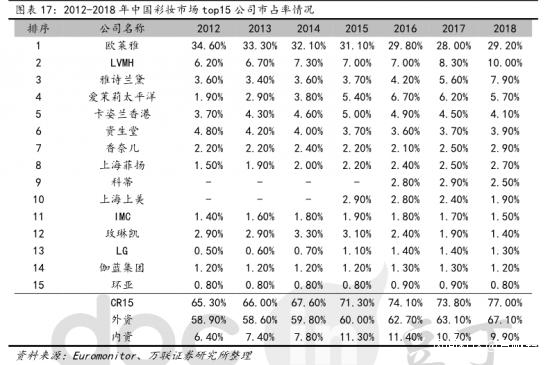 2017年之前,國內外美妝市場幾乎被歐美、日韓等品牌大比例佔領。據Euromonitor、萬聯證券研究所數據顯示,2018年中國彩妝市場前15家化妝品公司佔據了市場77%的份額,其中外資佔比67.10%。