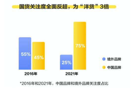 據百度搜索大數據顯示,從2016年到2021年,國民對國貨的關注度,已從全面反超“洋貨”,變成“洋貨”的3倍,這為本土消費新品牌佔領用户心智創造了大環境。
