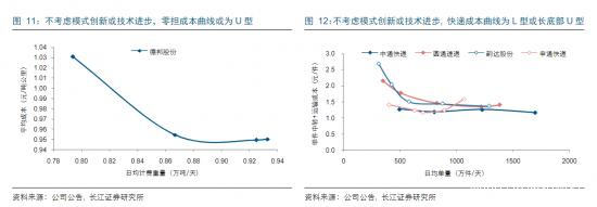 這個經驗,在快遞行業裏是適用的,但在快運行業裏卻不是。當快運企業的規模達到一定程度時,它的平均運輸成本呈現邊際遞增的趨勢,而快遞行業則是遞減或不變,下圖為德邦物流與通達系快遞公司的數據對比。