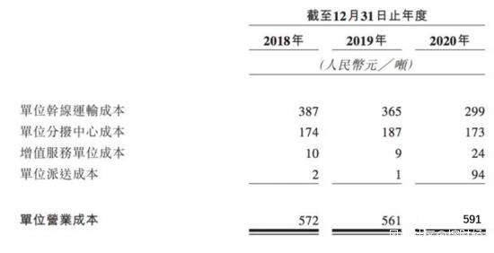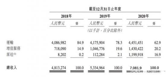 不過,我們再細看其經營數據,安能目前的營收主要分為三部分,分別是運輸、增值服務及派送。其中,主營收入為運輸收入,過去三年間從40.8億增長至44.5億,增長幅度為8%。