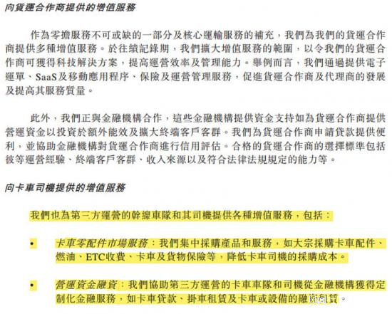 具體來看,安能的增值服務板塊主要指為車隊及司機提供軟件和金融服務,以及協助其採購相關配件,成為產品貿易商。