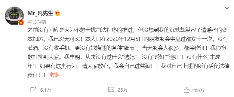 沉默數日的吳亦凡,則於19日早八點左右通過微博回應,自己沒選過妃也沒組過未成年酒局,一直不發聲是不想幹擾司法程序推進,並放狠話如果都美竹所言屬實,他會自己進監獄。