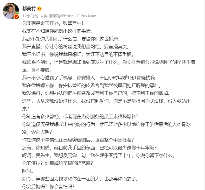 但這些,都遠遠比不上初代頂流吳亦凡的瓜勁爆。五月底的一場電影竟蔓延出一片瓜田,扯出凡凡的N個女友不説,前女友之一都美竹發文背刺,稱其大搞“選妃”,鍾愛對未成年和00後出手。