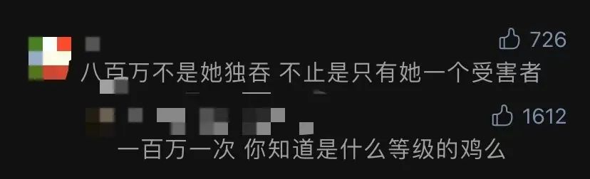 第三,都美竹吃相難看,800萬分手費是什麼鬼?什麼逼值得了800萬。評論區有讀者説這800萬不是她一個人獨吞,有好幾個受害者。作者回復得簡單粗暴:「一百萬一次,你知道是什麼等級的雞嗎?」