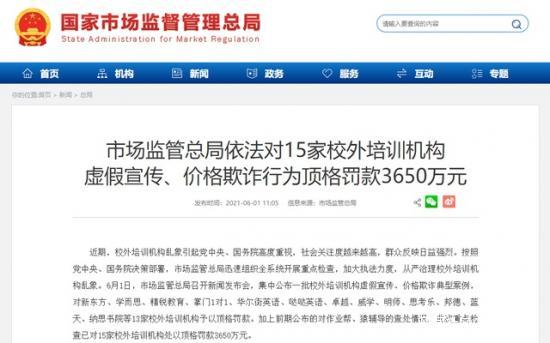 據全國12315平台關於教育培訓的投訴舉報數據顯示,2021年第一季度,教育培訓服務投訴舉報達到4.71萬件,同比增長65%。今年六月,經過市場監管部門對新東方、學而思、掌門1 對1、華爾街英語等多家校外培訓機構的檢查後發現,共有15家機構存在違法行為。