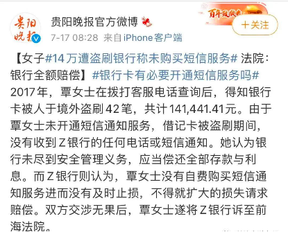未開通短信通知,女子銀行卡遭盜刷14萬,法院:銀行全額賠償_風聞