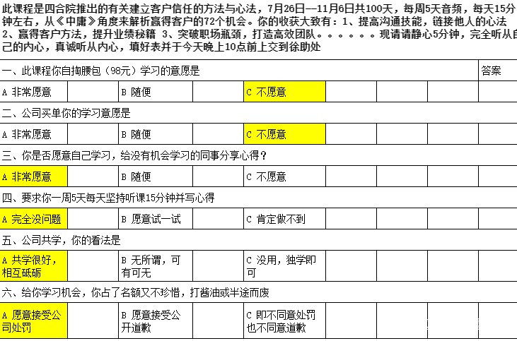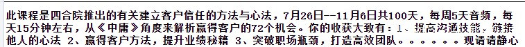 還是拿我現在的公司舉例子,這些東西再好,老闆也知道就是圖個樂,但他還是願意讓員工去參與,為什麼?是他真的認可《中庸》嗎?不是,是因為【1、提高溝通技能,鏈接他人的心法 2、贏得客户方法,提升業績秘籍 3、突破職場瓶頸,打造高效團隊】,這3點課程效果打動了他。