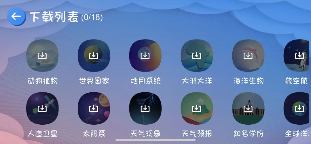 打開“北斗AR地球儀”,有18個素材可供下載,素材包大小在幾兆到百兆之間。除了地球上存在的動植物、大洲大洋、天氣、知名學府、洋流等等,甚至還能看太陽系、地月系統、人造衞星、航天飛機等等。