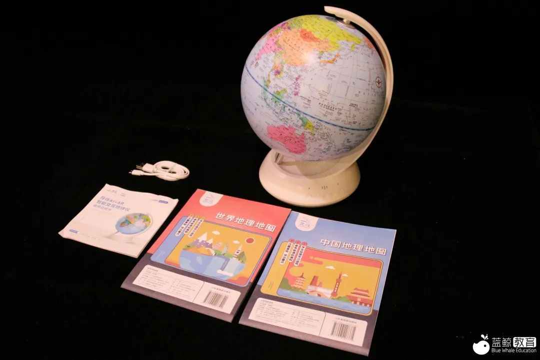 這款月半地球儀並不大,包含地軸高28釐米、寬21釐米,可以放置於書桌一角。藍鯨教育在説明書和外包裝中沒有找到地球儀的材質,不過整體感覺沒有劣質的塑料感。地球儀附帶世界地理地圖、中國地理地圖以及一條數據線。