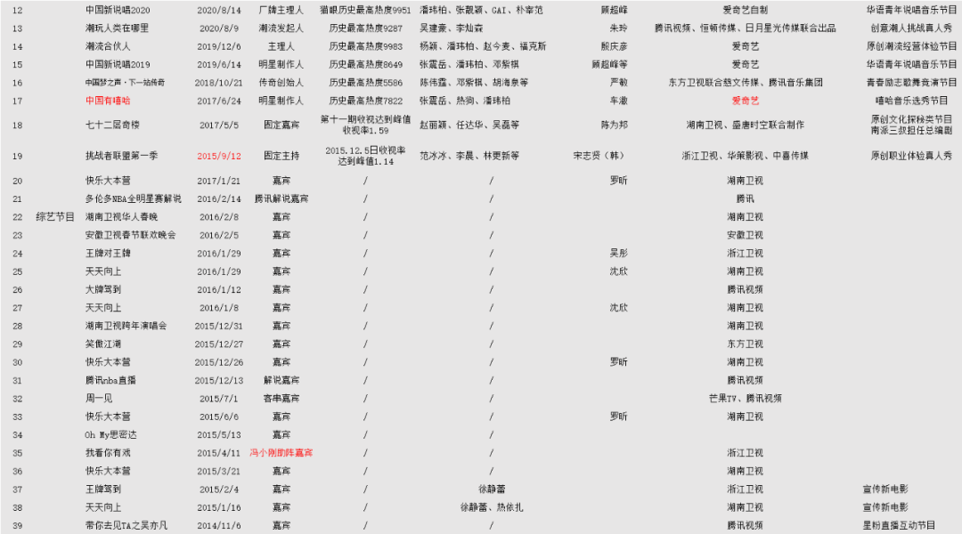 與吳亦凡合作的視頻平台,也形成了一個明顯的分割線。2017年之前,騰訊視頻與吳亦凡的合作最頻繁,幾乎沒有愛奇藝、優酷等的蹤影。2015年和2016年,吳亦凡曾兩次做客解説騰訊NBA,並多次接受騰訊自制訪談節目採訪。