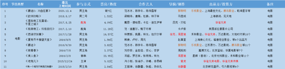 我們來看這些電影背後的出品方。徐靜蕾之後,吳亦凡被馮小剛看上,出演了《老炮兒》小飛一角,演技生疏的他與馮小剛演對手戲,出品方是誰呢?華誼兄弟電影、華誼兄弟傳媒。