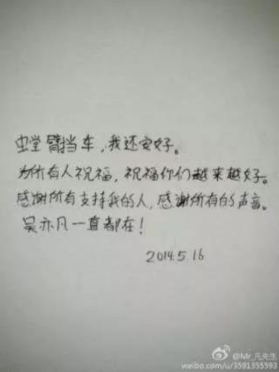 然而,就在事業進入高速上升期時,2014年5月,吳亦凡突然一紙聲明,宣佈與SM解約。之後的一天,他發佈了“螳臂當車,我還安好”那篇著名微博,正式宣告退團。