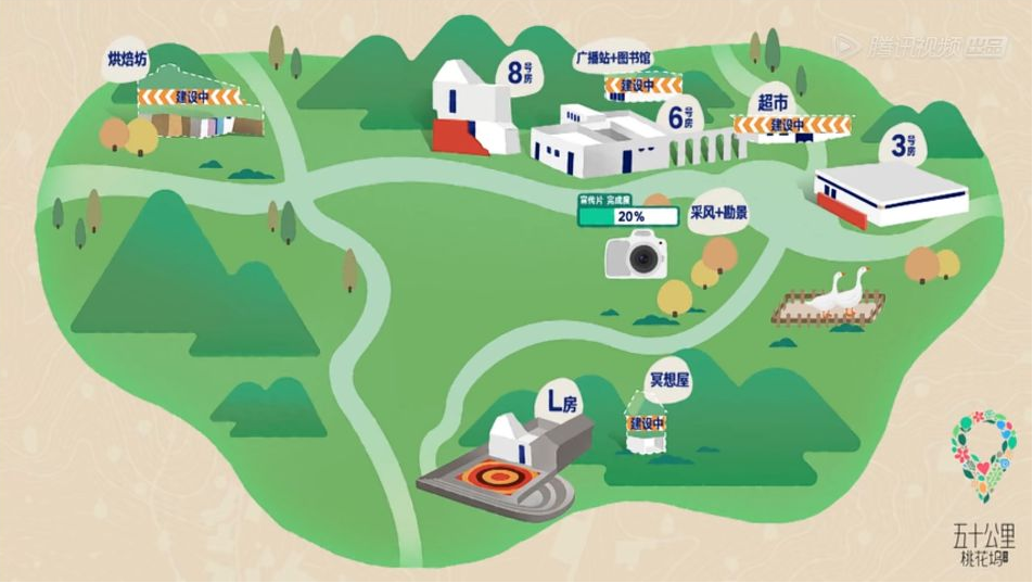李雪琴、辣目洋子、汪蘇瀧建設圖書館,收納二手書,並附帶建設廣播站,為遠道而來的文藝青年提供文化需求;宋丹丹、舒淇、周杰搭建冥想屋,讓那些想要逃離都市的人羣能與自己獨處,偷得浮生半日閒;張翰、賴冠霖、周也、孟子義扛起了桃花塢宣傳大旗,自行堪景、採風,製作桃花塢宣傳片,讓更多人知曉在北京的50公里外還有這樣一個世外桃源;彭楚粵與周也建設DIY烘焙坊,希望在治癒自己的同時也能治癒他人。