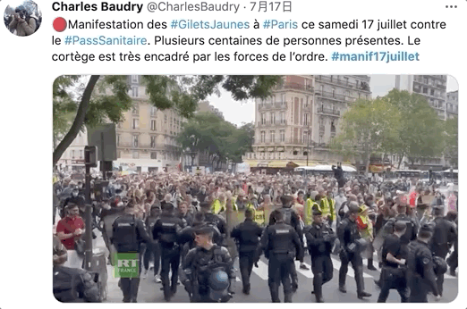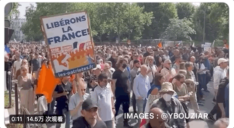 與此同時,約有1500人在巴黎南部的街道上舉行示威,而且還是在黃馬甲人物Jérôme Rodrigues的帶領下,大家舉着“通緝:法蘭西共和國-民主,2021年7月12日消失”、”反對健康證,停止獨裁”等標語,以及“自由”和“馬克龍獨裁者”等口號。”