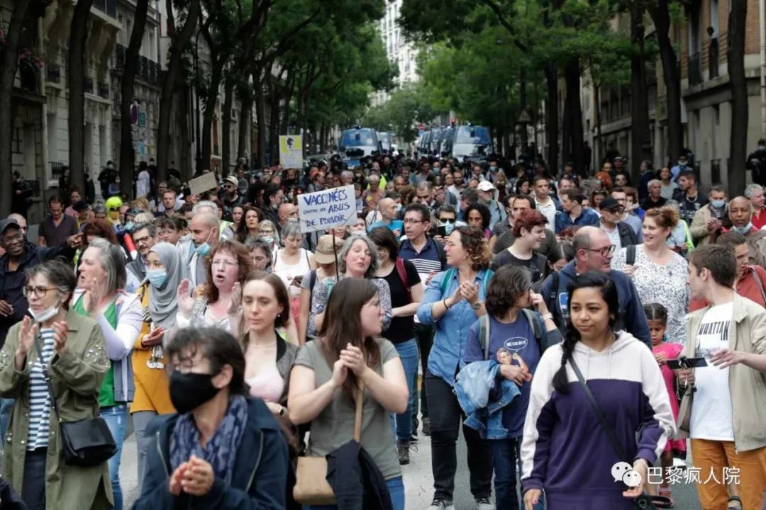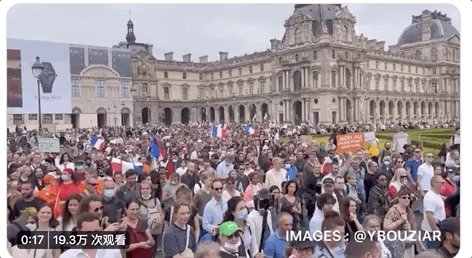 在巴黎,週六下午就有三個不同的集會,至少聚集了18000人。第一支由幾千人組成的遊行隊伍從Palais-Royal出發,在“自由!”、”反對健康獨裁!”和“馬克龍辭職!”的口號聲中穿越塞納河。