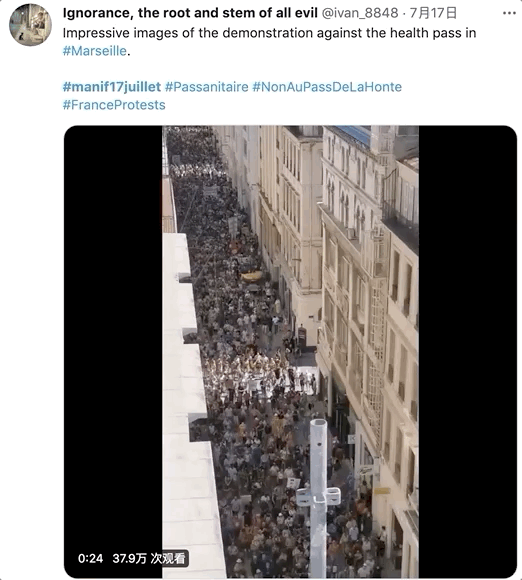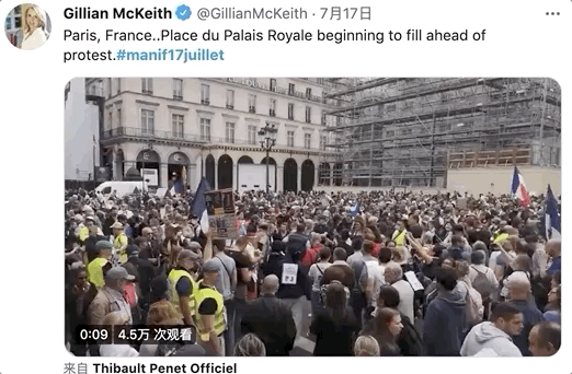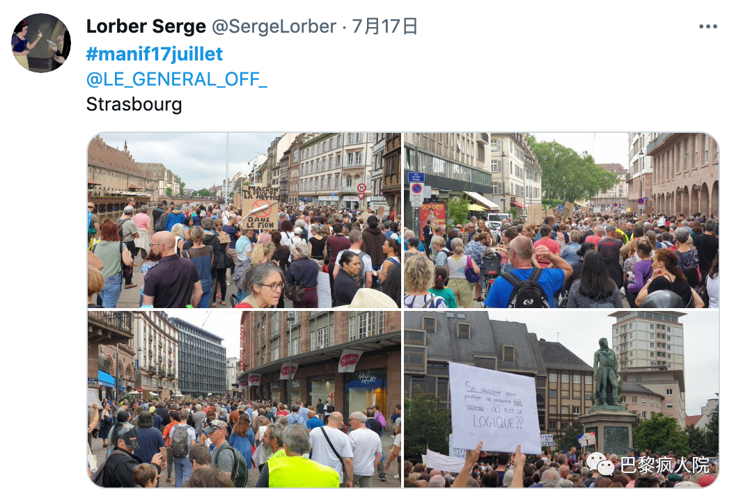 據內政部稱,從巴黎到佩皮尼昂(Pyrénées-Orientales省),從里昂(羅訥省)到坎佩爾(Finistère省),7月17日星期六全法有近11.4萬人示威遊行,反對接種疫苗和健康通行證!