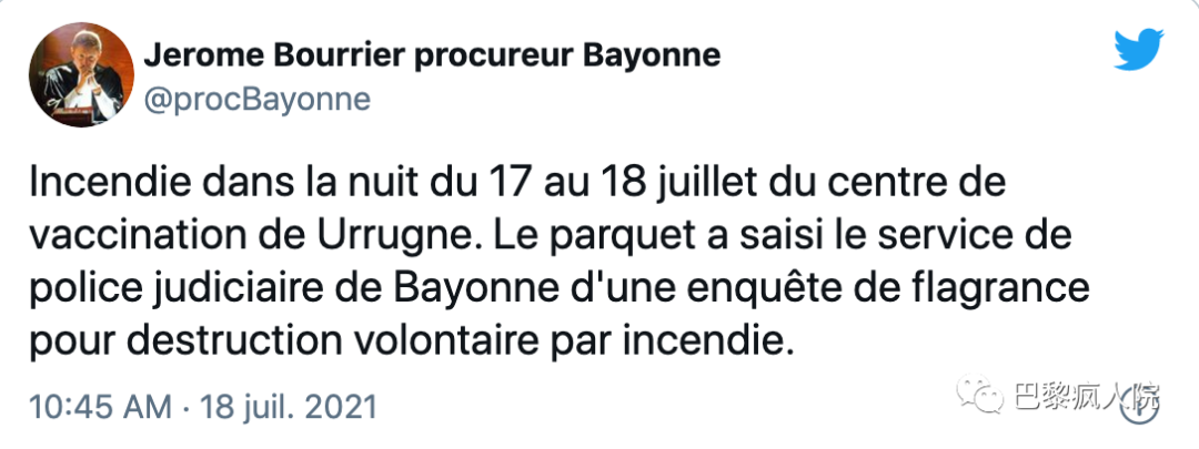 週六到週日的晚上,在Pyrénées Atlantiques,一個疫苗接種中心被放火燒燬。根據第一手調查顯示,這是一次蓄意縱火。